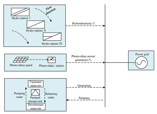 This paper examines a complementary coordinated system as its experimental case study, which consists of cascaded hydroelectric stations, a local photovoltaic station, and a local pumped-storage station located within a specific river basin. The timeframe for short-term economic dispatch is set to one day. Within this basin, the cascaded hydroelectric station configuration follows a serial topology. The hydroelectric, photovoltaic, and pumped-storage stations are interconnected in parallel, allowing for the integration of their combined output into the grid for dispatch purposes. It is noteworthy that the parameters of the cascade hydropower stations, pumped-storage power stations, and photovoltaic power stations selected in this paper all take into account the mutual influences among various new energy power stations, including their relative positions and the scale of the stations. The topology of the HPPCS is as follows.