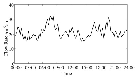 In this study, the initial water level for the cascaded hydroelectric stations is set to correspond to their normal storage levels. The water level–storage relationship curves for each station are established and available. The average incoming flow rate between inter-stage hydro-power stations, representd as , is fixed at 5 m3/s. For the purpose of these calculations, the water travel time delay is considered to be one time interval. This implies that water discharged from an upstream hydroelectric station reaches the downstream station in the following time interval. Figure 3 illustrates the daily natural inflow rate of hydroelectric station I.