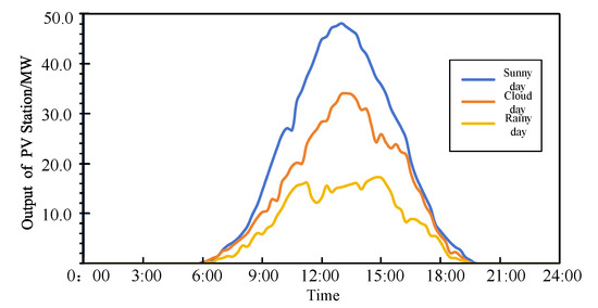Photovoltaic (PV) power generation is notably impacted by the weather conditions, resulting in fluctuating and random output across different weather scenarios. On sunny days, the output is typically high, but fluctuates in response to changes in sunlight. During cloudy conditions, there is a noticeable decrease in output, accompanied by more pronounced fluctuations due to the variability of sunlight. On rainy days, the output is generally at its lowest, with significant variability and randomness in sunlight, leading to the most substantial fluctuation in output. Since this study focuses on a daily dispatch model, the typical season of summer is chosen as the validation scenario. The scheduling period is one day. In this study, power generation data from a 50 MW PV power plant located in the watershed area are selected for three typical weather condition—sunny, cloudy, and rainy. These data serve as the fixed output data, and the output characteristic curve under these conditions is depicted in Figure 4.