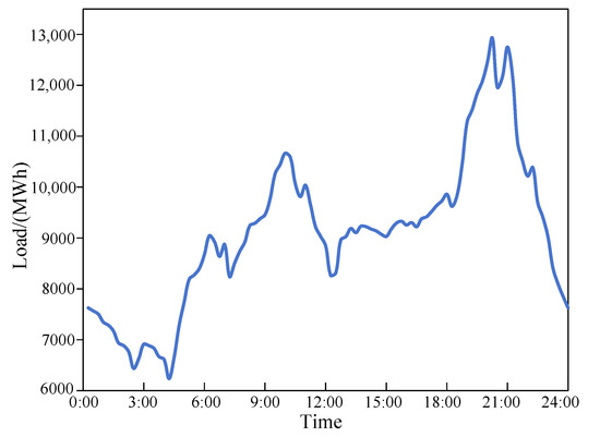 This paper utilizes the typical daily load curve of the electrical grid in the specified basin as a benchmark for determining the average designed output of the HPPCS. The daily load characteristic curve exhibits distinct temporal features, with the electrical grid load reaching its peaks around 10:00 a.m. and 9:00 p.m. and its lowest points around 1:00 p.m. and during the early morning hours. This pattern mirrors the typical daily variations in electricity consumption. In consideration of the system’s role in providing active power balance auxiliary services, the average designed output curve is modeled to fluctuate in accordance with the load curve’s trend. The daily load profile is depicted in Figure 5.