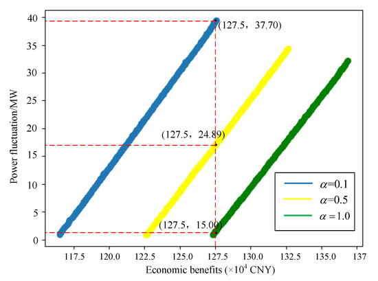 From the analysis of the Figure 6, it is observed that, with the increase in the proportion coefficient , there is a reduction in the power fluctuation of the HPPCS, while maintaining the same economic benefit of CNY 1.275 million. Specifically, the system power fluctuations are 1.1 MW, 16.2 MW, and 38.3 MW for increasing values of . Additionally, as the participation coefficient in active power balance services increases, the system’s output trend aligns more closely with the load curve fluctuations, thereby enhancing the model’s performance in meeting the two targeted objective functions. As indicated by Equation (4), the economic benefits of the hydropower–photovoltaic-pumped storage complementary system are influenced by the coefficient . The fee received for participating in active power balance auxiliary services, representd as , exceeds the feed-in tariffs for system power generation, represented by . Consequently, with an increase in , the scheduling model gradually shifts towards a single-objective-optimization problem. Under the identical condition of power fluctuation, the economic performance of the model shows improvement. In summary, an increase in the scale factor leads to enhanced economic efficiency of the model.