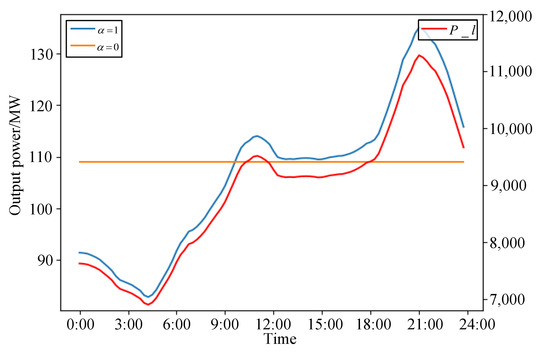 Furthermore, the coefficient reflects the extent of the HPPCS’s participation in active power balance auxiliary services. It facilitates the alignment of the system’s designed output with the electrical grid load curve at varying proportions. Figure 7 compares the grid load curve with the system’s designed output curves at and . In this figure, P_l represents the daily load curve. It is observed that, at , the designed output of the HPPCS fluctuates precisely in accordance with the load trend. Conversely, at , the system’s designed output is represented by a flat line, indicating no responsiveness to fluctuations in the load curve. When is set to 1 in Equation (3), and assuming no losses in the pumped-storage station, the average designed output of the system equates to the total output of the HPPCS, adjusted by the load coefficient. In this scenario, the system fully participates in active power balance auxiliary services, leading to a designed output that perfectly matches the fluctuations of the grid load curve. Conversely, with , the average designed output is decoupled from the load curve, signifying no participation in auxiliary services. The optimized result under this condition is depicted as a straight line, failing to represent the peak-shaving and valley-filling regulation capabilities of the system.