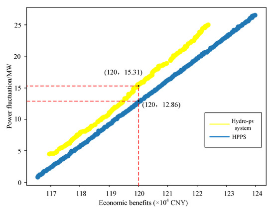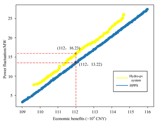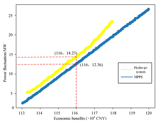 (2) The system demonstrates reduced power fluctuations at equivalent economic benefit levels, signifying its enhanced performance over traditional hydro-photovoltaic systems. The Pareto solution set pertaining to the optimized scheduling of the HPPCS is more extensive, offering solutions better suited for individual objectives.