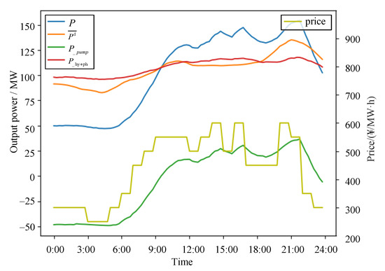 In Figure 11, curve P represents the total output of the system, curve represents the average designed output, and represents the combined output of the hydroelectric and photovoltaic stations. is the output curve of the pumped-storage station, while the ‘price’ curve reflects the electricity price trend. The comparison of curves P, , and reveals that, although the total output of hydro- and photovoltaic stations loosely aligns with the electricity price trend in pursuit of maximum economic benefits, this correlation is not strongly evident. This is primarily because the output of cascaded hydroelectric stations is constrained by various factors, including limitations on reservoir water discharge, water level fluctuations, and the turbines’ maximum capacity. These limitations narrow the output range of the stations, thereby affecting the flexibility of the hydro-photovoltaic-complementary system. The curve illustrates that the output of the pumped-storage station varies in accordance with the electricity price trends, constrained only by the reversible turbine’s capacity and the inflow and outflow constraints. Integrating pumped-storage stations into the system enhances not only the flexibility of power output, but also ensures that output fluctuations are more closely aligned with electricity price trends. This approach results in higher power generation during periods of high prices and reduced output when prices are low, significantly improving the HPPCS’s ability to maximize economic benefits.