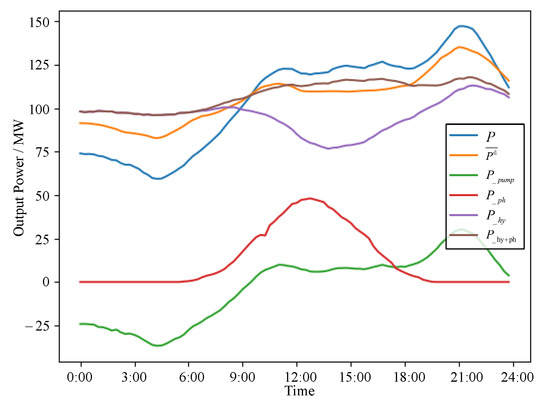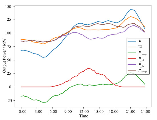 The subsequent Figure 14, Figure 15 and Figure 16 illustrates the daily total output curves of the HPPCS under three typical scenarios. This includes the system’s daily total output curve (P), the average designed output curve (), as well as the daily total output curves of the cascaded hydroelectric stations (), the photovoltaic station (), and the pumped-storage station (). This display effectively demonstrates the daily power output process of the entire HPPCS, providing a comprehensive view of its operational dynamics.