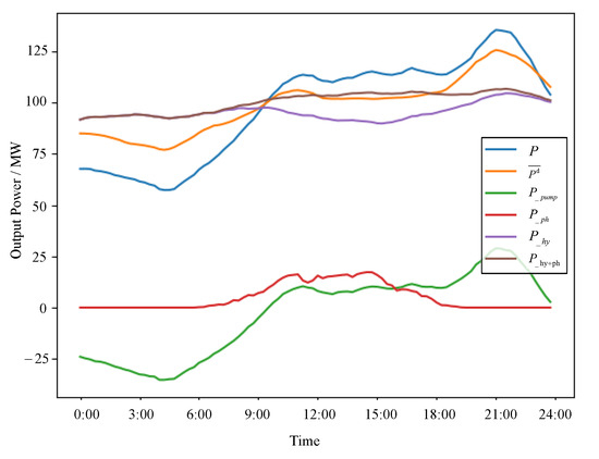 From 15:00 to 24:00, curve P, representing the total system output, follows the trend of , albeit being slightly higher. Its ability to track the fluctuations more effectively than is particularly notable. During peak load periods within this time frame, the HPPCS engages in electricity generation by releasing water from the pumped storage, demonstrating its peak-shaving capabilities. This underscores the pivotal role of the pumped-storage station in peak-shaving and auxiliary regulation. With the reduced output from photovoltaic stations and the inherent limitations of cascaded hydroelectric stations, curve fails to demonstrate effective fluctuation management during periods of high load. Its trend remains relatively flat, signifying a limited capacity to adapt to the designed output fluctuations. This limitation highlights the superiority of the HPPCS, which can more effectively manage power fluctuations and align with the designed output trends.