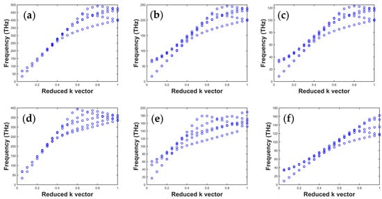 For instance, Figure 2 illustrates six PBSs for PtCs with the same d and r pair both equal to 0.3a, but different a and H to show the influence of the main parameters. It should be noted that only the five lowest solutions for the photonic band exist in the PBS, which maintains the band distribution’s relative simplicity within the PBS. First, in Figure 2a–c, PBSs with the same a/H ratio are compared, where the magnitudes of a and H in the three PBSs are (a) a = 220 nm, H = 110 nm; (b) a = 440 nm, H = 220 nm; and (c) a = 880 nm, H = 440 nm. All three PBSs show the same mode configurations, and the frequency ranges shown in the y-axis are the only differences that can be observed, revealing that equally and proportionally enlarging or reducing the size of the PtCs only affects the total frequency ranges of the final PBS. Second, in Figure 2a–f, PBSs with the same value of a but different values of H are compared in groups, where the parameters are (d) a = 220 nm, H = 220 nm; (e) a = 440 nm, H = 660 nm; and (f) a = 880 nm, H = 220 nm. When observing the three pairs of PBSs, the configurations are clearly changed but maintained in the same frequency range, concluding that adjusting H affects only the mode configurations. Finally, PBSs with the same value of H but different a values are compared in Figure 2b,d,f. Due to the setting of w, adjusting a also changes the width of the nanobeam at the same time and, therefore, affects not only the frequency ranges but also the configuration of the whole PBS.