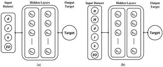 Configuration sketch of the ANN for (a) standard fishbone structure training and (b) adjusting a and H training.