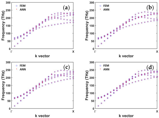 The PBSs of the standard fishbone PtCs are first calculated by the FEM using a PtC unit cell. The raw PBS data are then combined and reshaped according to the feature matrix for the ANN input layer and the target matrix for the output layer. During the training process, the training dataset is separated into three parts by a certain ratio (7:2:1 in this part) that can be defined as the training data, the validation data, and the testing data. Figure 4 illustrates the four PBSs calculated by the FEM (in the blue circle) and predicted by a trained ANN (in red points) for the standard fishbone PtC. To balance the complexity and the performance of the ANN, the prediction accuracy of the data that are and are not included in the training dataset is required for judgment, where the accuracy for the data included in the dataset represents the basic performance of the ANN, and the accuracy for those not included can show whether the net is overfitted or not. By calculating the linear regression for the predicted value and the target value, the slope of the regression line can be treated as the accuracy for the corresponding issue. According to the range of d and r, the PBS data of the PtC structure with d = 0.1a and r = 0.15a, shown in Figure 4a, are contained in the training dataset and show great accuracy with a high regression coefficient R of 0.99997 and a training time of around 30 s, while a single FEM calculation needs around 120 s.