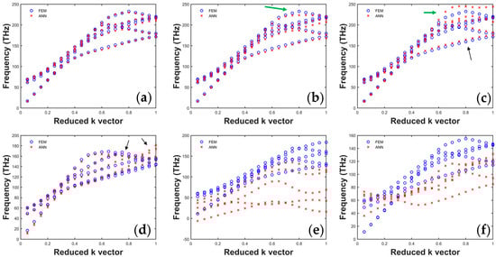 Finally, the dataset aH2 fixes the a/H ratio and produces less change in the PBS configurations, but more in the frequency range. For the data in the a/H training list, Figure 5c maintains good prediction results but fits less than in H220. The data pointed out by the green arrow have a larger mismatch than in H220, and those pointed out by the black arrow also show worse fitting than in H220. In Figure 5f, the mismatch problem still exists in predicting the structure with parameters not included in the a/H training list. As described in Figure 2, adjusting a/H will only affect the frequency range and maintains the entire configuration of the PBS. The limited information then causes the mismatch of most of the points.