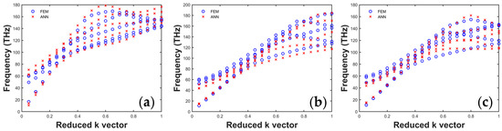In the following sections, the prediction results obtained with the trained ANN will be discussed in terms of several combinations of geometric parameters, especially for different lattice constants and different thicknesses, which affect PBSs the most. The raw PBS data calculated by the FEM will be separated into the training group and the testing group, where the former is used for training the ANN, and the latter is used to test the trained ANN for comparison.