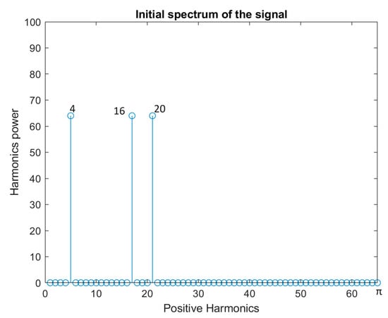 The three harmonics power that appear at the 4th, 16th and 20th positions (dc corresponds to zero frequency component and is located at position 1). From the power spectrum it is not possible to distinguish that the 20th harmonic is the result of coupling the other two.