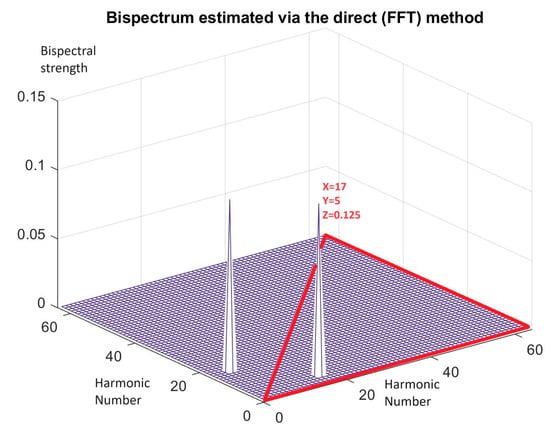 The bispectrum, derived from applying a two-dimensional Fourier transform to the third-order autocorrelation function , proves to be effective in identifying and quantifying quadratic phase coupling (QPC) [1,2,41]. Additionally, the bispectrum functions as a means to elucidate statistical associations among various frequency components within a signal. The formal definition is as follows [1]:
