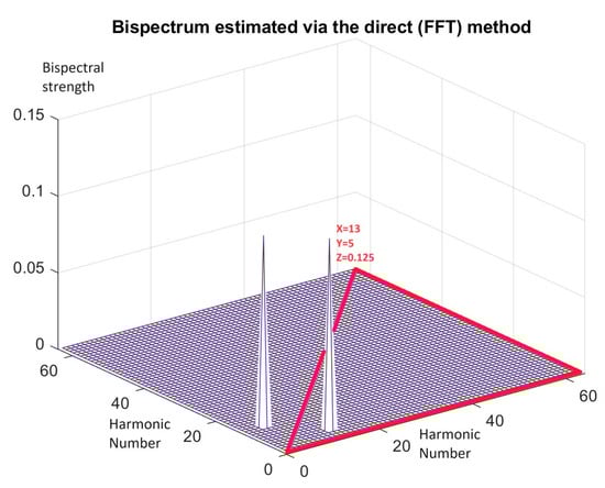 The material cited in the following paragraphs highlights the great importance of the bispectrum in the analysis of many categories of signals. Accordingly, as it is well known, non-linearities play a crucial role in power system signals, serving as key indicators of various physical behaviors, including frequency interactions [1,2,3,4,5,6], inter-harmonic effects on power systems [6,8], incipient failures [2], noise cancellation [9] and phase coupling [3,4,9]. Traditional techniques for assessing rotating asymmetry, such as imbalance and bending shafts, have been proven effective in recent years [4,8,9,10,11,12]. However, these conventional methods often assume signal linearity and stationarity, limiting their applicability to diverse situations [13,14,15]. The underlying concept is that as power systems degrade, they tend to exhibit increased non-linearity, leading to the generation of new frequency components [16,17,18]. These new frequencies become phase-coupled with the original interaction frequencies, giving rise to what are known as non-linear interactions. The phase coupling correlation between the original interacting frequencies and the new frequency is recognized as quadratic phase coupling (QPC), serving as a real signature of non-linear interactions in dynamic systems [6,9,16,18]. Detecting QPC relationships in a signal is therefore a crucial element in understanding non-linear physical systems, particularly in the context of power generation.