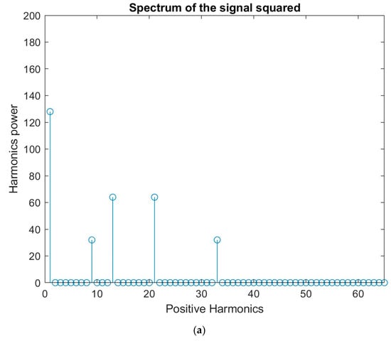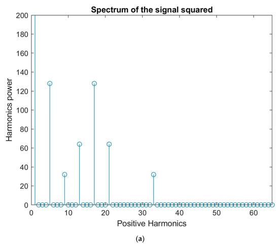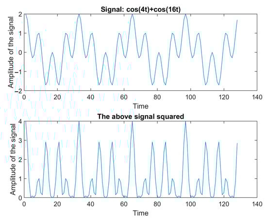 Above: A composite signal of two harmonics with frequencies and . Bellow: The same signal squared according to Equation (12). The parameter “Time” in the horizontal axis is normalized to the sampling period of the digital system used.