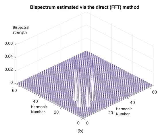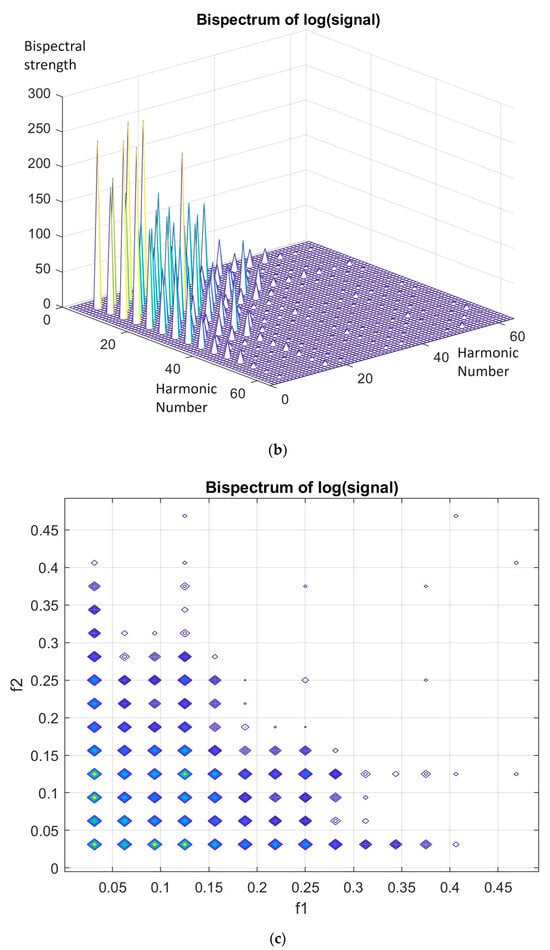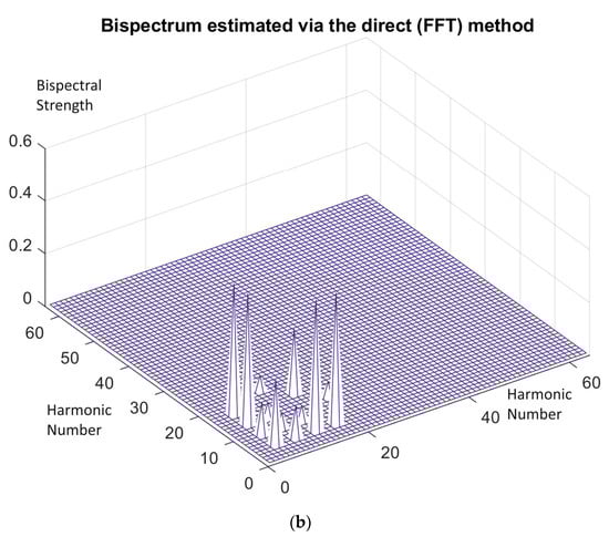 Over the past decades, higher-order spectra (HOS) [1,2], also known as polyspectra, have earned recognition as a sophisticated mathematical and signal processing tool for nonlinear system analysis. It is acknowledged that the traditional power spectrum, defined as the Fourier transform of the autocorrelation sequence (the second-order cumulant), fails to provide information about the phase of the system’s frequency response and does not indicate any evidence of nonlinearity. This means that phase couplings between harmonics cannot be detected from the power spectrum of the signal, since it only provides information about the power of each harmonic it contains and not the relevant phases among the harmonics [1,2,3,4,5,6]. The HOS are defined as the multidimensional Fourier transform of higher order cumulants of a stationary random process, thereby overcoming the limitations of power spectra. The structure of HOS allows the deduction of various properties of signals that do not emerge when using the power spectrum alone. For instance, different signals can have the same correlation function or power spectrum, but they can be distinguished by employing HOS. Additionally, various signal processing methods using HOS are employed to address problems that cannot be resolved solely through second-order statistics. The bispectrum, a second-order HOS, serves as a useful tool for identifying processes that are either non-Gaussian or generated through non-linear mechanisms. The bi-coherence, a normalized version of the bispectrum, is extensively utilized as an index of the quadratic phase coupling degree in the signal of interest [1,2,3,4,5,6].