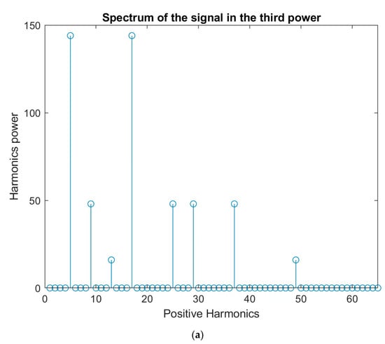 (a) Harmonics power derived after passing two sinusoids with frequencies and without a dc component through a cubic non-linearity. (b) The two sinusoids derive many peaks in the bispectral representation when passed through a cubic non-linearity. Peaks with different strengths are present.