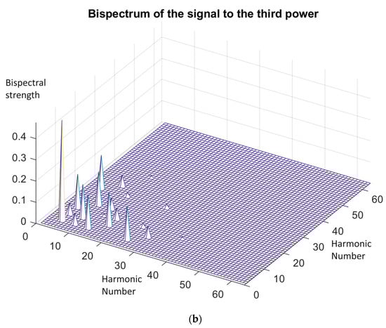 Furthermore, other bispectral applications incorporate high voltage systems, fault signals, gear faults and other mechanical issues. Specifically, the work by Mitiche et al. [19] investigated the classification of insulation faults in a high voltage environment, based on real-world time-series signals labelled by condition monitoring experts. The proposed approach exploited the Bispectrum analysis and deep learning for feature extraction and classification. Grover and Turk [20] proved that deep convolutional neural networks, when trained on bispectrum images of fault signals using transfer learning, provide highly accurate and reliable results for fault diagnosis that are on par with the state-of-the-art results. A squeezed modulation signal bispectrum approach was developed by Xu et al. [21] to concentrate the leaked energy for accurately diagnosing gear faults with motor current signals. Bollineni et al. [22] developed a more refined method based on convolutional neural networks and the vibration bispectrum to increase the effectiveness and accuracy of fault diagnostics in bearings. The work in [23] proposes a novel multiple amplitude modulation and frequency modulation (AM–FM) demodulation method based on a local modulation signal bispectrum, which can demodulate the fault features of different components from the gearbox signal with multi-mesh frequency bands and multi-modulation components. The research by Hashempour et al. [24] introduced a novel algorithm so that Gaussian noises that appear in non-linear and unstable vibrations of motors are removed using wavelet decomposition, and non-linear noises are suppressed using the bispectrum method. Bispectrum analysis was employed in [25] to study the non-linear dynamic characteristics of a beam structure containing a breathing crack, from the perspective of numerical simulation and experimental validation. The use of higher-order spectral analysis, especially bispectrum and trispectrum analysis, for fault detection is gaining importance in recent studies due to the many advantages of HOS [26].