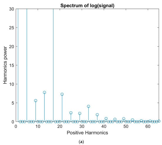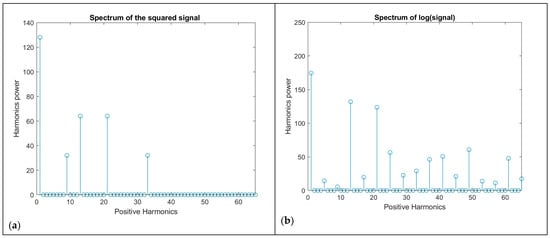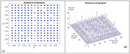 Finally, considering the case when the signal with and goes through a logarithmic transformation, where is selected so that the signal is always positive, a large variety of new frequency components appear, as shown in Figure 10a (in the example using and ). The produced peaks in the bispectrum cover all the available region in points that are additions or subtractions of and and their multiples. This result is depicted in Figure 10b.