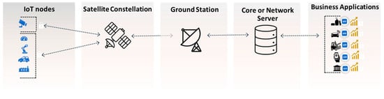 As shown in Figure 1, the satellite IoT solution on Earth comprises five fundamental layers [,]. In the first layer, there are IoT nodes, whose function is to acquire data from the physical environment and send it through low-power area network (LPWAN) communications to satellites in LEO. These satellites make up the next layer, consolidate data transmissions, and forward the data received from the IoT nodes to the ground station. In the third layer, the ground station receives the satellite data. It forwards it to the core layer or network server, which monitors and regulates the communications between the IoT nodes and the satellites and performs data ingestion. The network core, or network server, is responsible for transmitting data from IoT nodes to business applications and carries out authentication, authorization, and accounting tasks to ensure adequate security of services. Finally, the last layer is the application layer, which receives data from the satellite network for processing and displays it to the user.