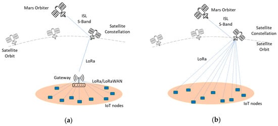 As shown in Figure 3, communications between IoT nodes and the satellite constellation in Mars orbit can have two communication models: Direct-to-Satellite IoT (DtS-IoT) and Indirect-to-Satellite IoT (ItS-IoT) []. In DtS-IoT communication, IoT nodes communicate directly with the constellation without an intermediary. On the other hand, ItS-IoT needs a gateway that centralizes all communications from nearby IoT nodes. This gateway collects data from IoT nodes and transmits it to the orbiting satellite constellation. Current rovers can be proposed as LoRa gateways for exploration on Mars since they currently act as gateways between sensors and drones with the Earth, such as the Ingenuity helicopter []. In the case of gateways, LoRa can be used on rovers or probes on the surface of Mars. It can provide coverage in open spaces of up to 15 km [].
