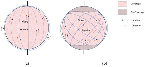When planning the deployment of satellite constellations for data collection, it is essential to consider the optimal constellation model and the revisit time of satellites over IoT nodes. In that sense, it is possible to propose two models: Walker Delta and Walker Star. Both are widely used in communication satellite constellations on Earth []. The Walker Delta model is characterized by a triangular arrangement of satellites in orbit and greater redundancy in communication. This configuration provides better coverage of areas near the equator. However, it does not adequately cover the poles, providing partial planet coverage []. The Walker Star model has an inclination angle close to 90 degrees [] to provide complete global coverage, including the polar regions []. That is why the model that we propose, due to its greater capacity to provide coverage to the polar regions, and the one used in the study, is the Walker Star. Figure 4 shows both models, highlighting the satellites’ coverage areas and orbital movements. Given the complexity of exploring the poles of Mars and the need to understand the interrelationship between polar deposits and its climate system, there is significant scientific interest in exploring Mars at high latitudes [].