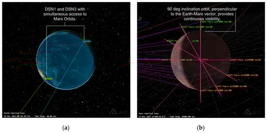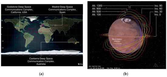 DSN and Mars orbit scenarios. (a) NASA’s Deep Space Network (DSN). (b) Mars orbital scenario and parameters.