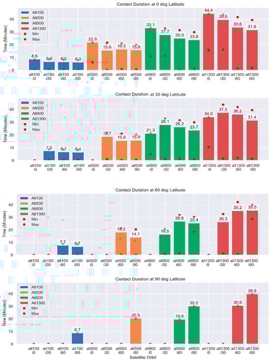 Contact duration for all analyzed Mars orbits and IoT devices at 0, 30, 60, and 90 degrees of latitude on Mars’s surface.