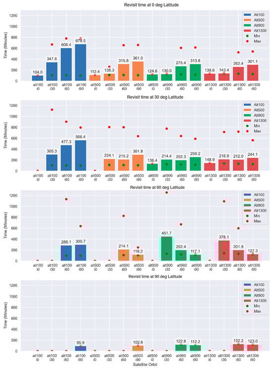 Satellite revisit refers to the time interval that elapses between two successive passes of a satellite over an exact location on the planet’s surface. This is a critical factor that influences the efficiency and frequency with which satellites in a constellation pass over a specific point on Mars and the visibility time of those satellites by IoT nodes. For its part, the factors that influence the determination of the revisit of a satellite over a specific point on the planet are the arrangement of the constellation, the orbital height, the inclination, and the latitude of the object in question []. The variation in revisit times and visibility of satellites over IoT nodes on Mars has significant implications for the planning and operation of space missions on the red planet. A greater revisit time allows for more frequent communication and more efficient data collection, while longer visibility times increase the window of opportunity for data transmission. On the other hand, the greater the inclination angle of the satellite to the equator, the greater the coverage at higher latitudes, as shown in Figure 4, ensuring coverage in the polar regions.