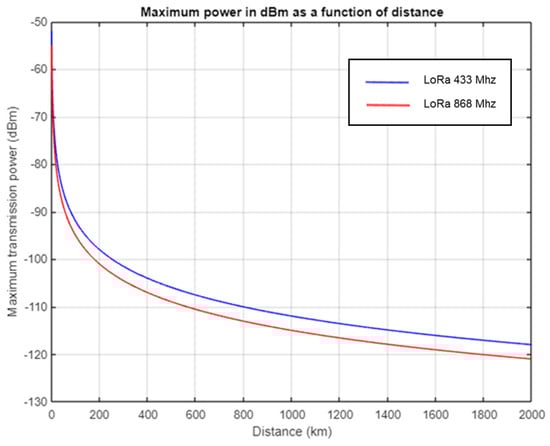 Figure 8 illustrates the relationship between the maximum transmission power and the maximum distance to the frequencies of interest. For 868 MHz, the maximum reception power at a 500 km distance from the IoT node is estimated to be −109 dBm, while at 1909 km, it is −117 dBm. For 433 MHz, the estimated maximum received power is −106 dBm at a 500 km distance, while at 1909 km, it is −120 dBm. Therefore, in all cases of interest, the power received in the satellite is higher than the sensitivity of −137 dBm. These results suggest that communications using LoRa technologies under the proposed conditions are feasible.