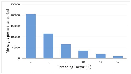 Also, the transmission rate must be considered based on the different spreading factors (SFs). From the SFs, the transmission data rate from the IoT nodes to the satellites in orbit can be determined and, thus, the number of messages each satellite can receive in its orbital period. The LoRa protocol uses various SFs to determine the type of communication, which determines the spectral efficiency of the transmission and affects the data rate [].