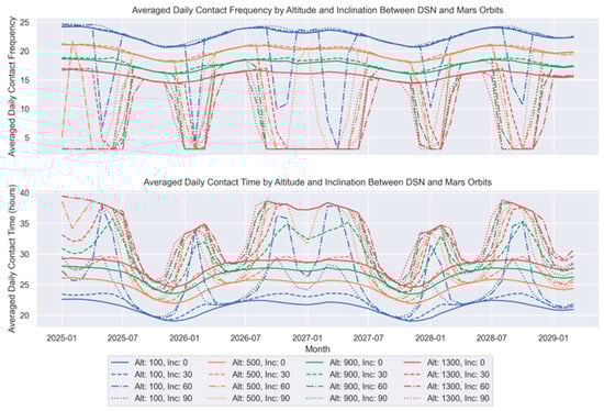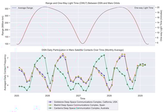 Figure 10 (bottom) depicts the varying involvement of each DSN ground site in maintaining communication with Mars-orbiting spacecraft. The graph highlights a notable trend: The Canberra station in Australia consistently provides the highest communication frequency, particularly when Mars is optimally positioned for the southern hemisphere. Conversely, the Goldstone and Madrid stations exhibit increased contact when Mars is better aligned with the northern hemisphere. This pattern underscores the need for strategic planning in ground station resource allocation to accommodate the periodic nature of Earth–Mars connectivity for optimal mission support.