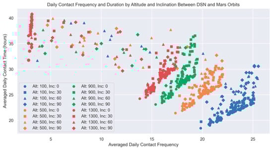 Scatter plot correlating the daily contact frequency and duration for each of the 16 Mars orbits.
