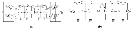 Disregarding the resonance compensation network voltage, current harmonic components, and switching losses, the system structure diagram will be the same as the one depicted in Figure 1b. The output voltage and RMS value of the output current of the H-bridge on the primary and secondary sides are determined by UP and US, and ILf1 and ILf2; the induced voltage and the RMS value of the coil’s current on the primary and secondary sides are determined by UCp and UCs, and ILp and ILs.