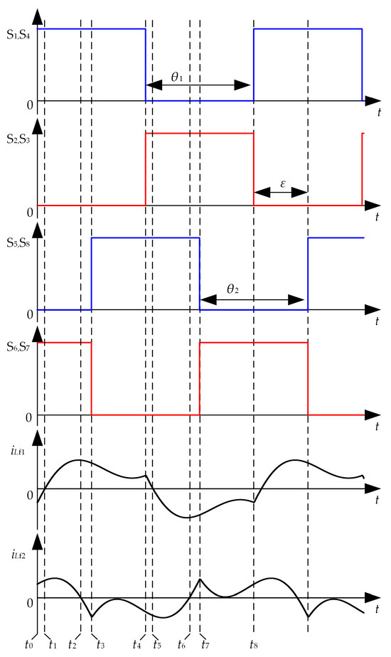 The power transfer mechanism of the MCR-BWPT system is categorized into two modes: forward power transfer mode from the primary side to the secondary side and reverse power transfer mode in the opposite direction. In this study, a D-LCL-type resonant compensation topology is selected, where both the primary and secondary sides possess symmetrical configurations. This symmetry ensures that the operating modes of both power transfer modes are similar. Figure 2 illustrates the waveforms of the driving signals and state variables of the switching devices in the D-LCL-type compensation topology MCR-BWPT system. The phase shift angle between the H-bridges bridges on the primary and secondary sides is denoted as “ε”, while “θ1” and “θ2” represent the intra-bridge phase shift angles of the H-bridge bridges on the primary and secondary sides, respectively. It should be noted that in this article, ε = π/2, θ1 = θ2 = π.
