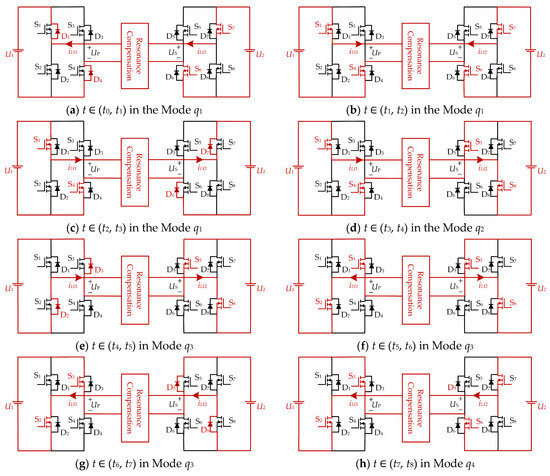 One switching cycle of the forward power transfer mode of the MCR-BWPT system is divided into four operating modes, denoted by q = [q1, q2, q3, q4]T.