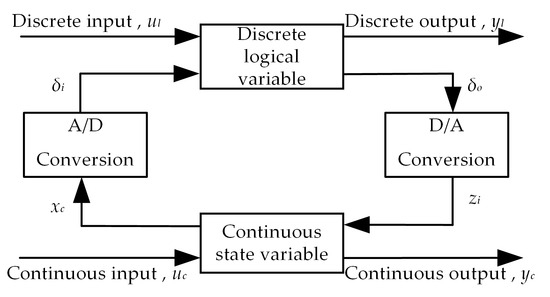 where x = [xc, xl]T is the state variable, with the continuous state variable xc ∈ Rnc and the discrete state variable xl ∈ {0, 1}nl, n = nc + nl; y = [yc, yl]T is the output variable, where the continuous output variable yc ∈ Rpc and the discrete output variable yl ∈ {0, 1}pl, p = pc + pl; u = [uc, ul]T is the input variable, where the continuous input variable uc ∈ Rmc and the discrete input variable ul ∈ {0, 1}ml, m = mc + ml; z ∈ Rrc is an auxiliary continuous variable and δ ∈ {0,1}rl is an auxiliary discrete variable; and A, B1~B3, C, D1~D3, and E1~E5 are system matrices.