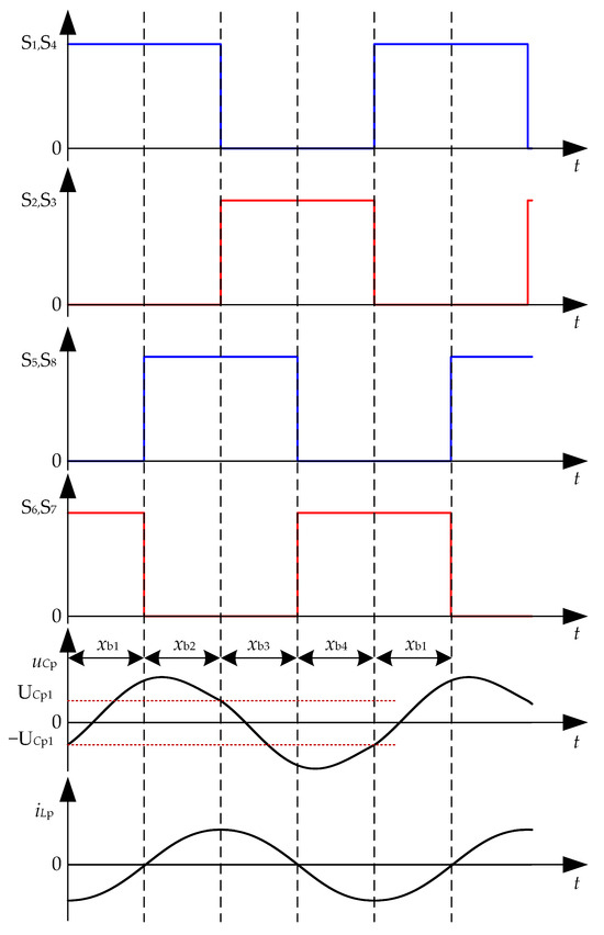 The establishment of the MLD model for the MCR-BWPT system hinges upon two critical aspects: the switching between the forward and reverse power transfer modes of the system and the determination of the appropriate switching conditions governing the transitions between each discrete state mode. Taking the forward power transfer mode as an example, the switching signals of the D-LCL type MCR-BWPT system and the shunt-compensated inductor voltage and coil mutual inductance current waveforms of the primary side are shown in Figure 6.
