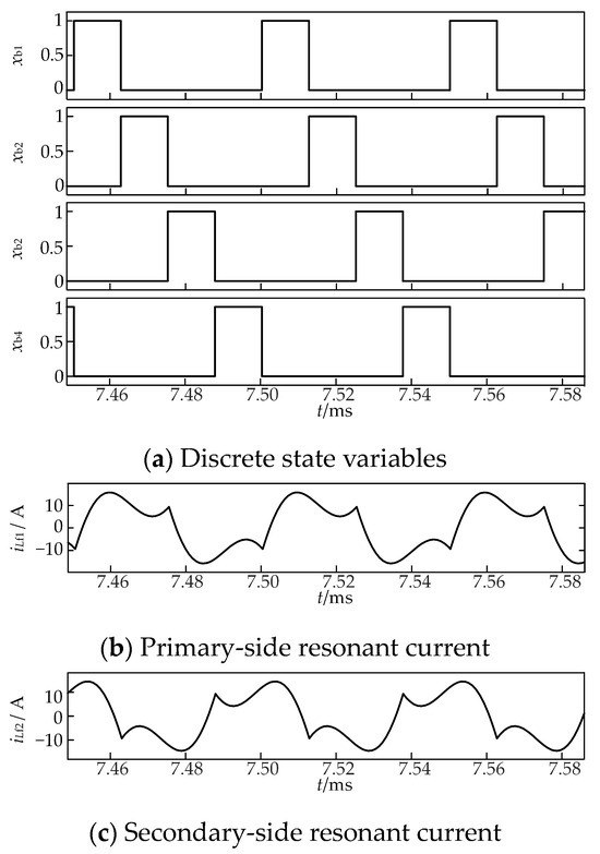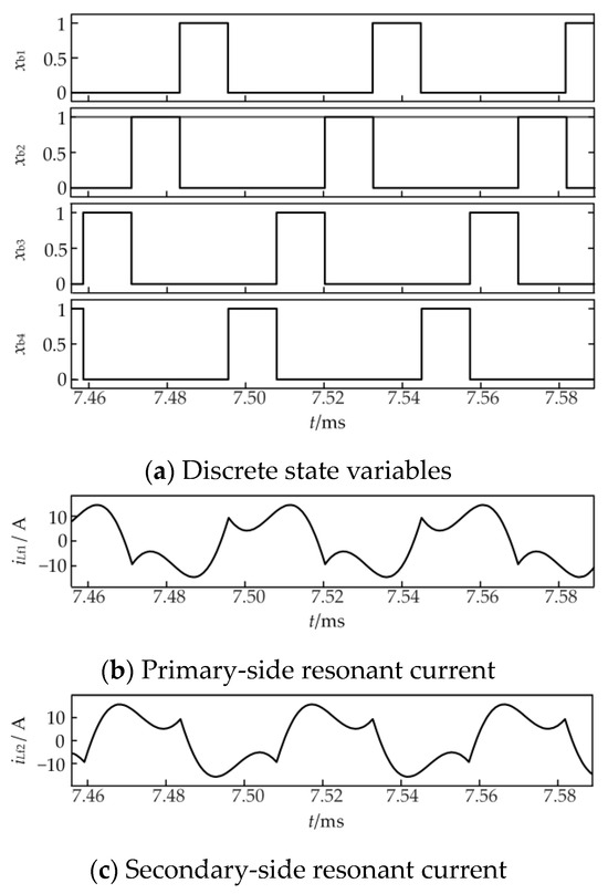 Figure 8 and Figure 9 show the discrete state variables and the simulated waveforms of the first and second series resonant compensating inductor currents for the MLD model of the MCR-BWPT system in forward and reverse power transfer modes, respectively. From the simulation waveforms, it is clear that the MLD model established in this article for the MCR-BWPT system takes the value of 1 for the four discrete state variables according to the switching order of the operating modes q1→q2→q3→q4→q1 in the forward power transfer mode, so that the system works stably in a cyclic manner; the switching order of the discrete state variables is opposite to that of the forward direction as the system is working in the reverse power transfer mode. Moreover, the primary and secondary resonant compensation inductor currents in the two modes of operation are in agreement with the theoretical analysis results. The results verify that the MCR-BWPT system MLD model is able to operate in a stable cycle and output a stable current according to the set switching logic.
