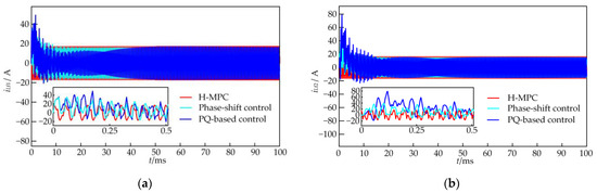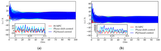 To verify the suppression effect of the hybrid predictive control strategy of the MLD model of the MCR-BWPT system on the current fluctuation of the system at startup, the hybrid model predictive control method in this paper is compared with the traditional open-loop dual-side double phase-shift control method and the PQ-based dual-side power control strategy proposed in Reference [27].