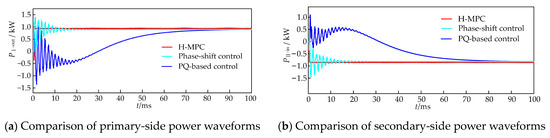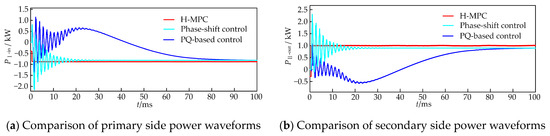 From Figure 10 and Figure 11, it can be seen that the traditional bilateral double phase-shift control method undergoes a transient process of about 0.25 ms. There is a certain degree of current oscillation during system startup, while the MCR-BWPT system using the PQ-based bilateral power control method is still in the transition state; the system is not yet in the resonance state, so this transient process is much longer. The system starts with a more significant degree of current oscillation and a larger amplitude of the transition process, which puts higher requirements on the current stress than the power switching devices of the MCR-BWPT system can withstand. With the control strategy proposed in this paper, the system enters the steady state directly after startup without any obvious transient process. The waveforms of the system’s first and second side resonant currents corresponding to the three control methods are the same in steady state, so the MLD-based model and predictive control methods have a shorter regulation time at startup, which is more conducive to the system’s stable operation.