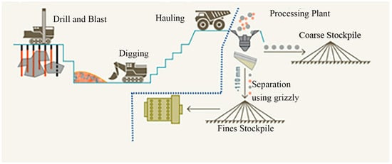 Figure 1 shows a simplified mining flowsheet where the first activity is drilling the in-situ rock, followed by blasting, then digging, hauling, and finally processing the ore. Drill and blast activities impact all these processes in a mine, influencing shovel productivity, equipment maintenance, highwall stability, ore recovery, and the related costs across all these processes. Therefore, it is necessary to utilize novel technologies, such as sensors, unmanned aerial vehicle (UAV), image processing, virtual reality, and teleoperation to address these issues [,,,].
