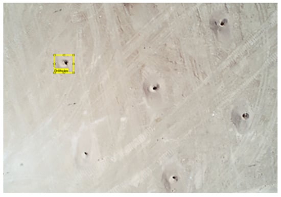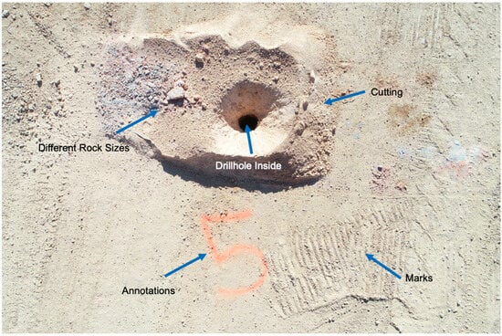 Blasthole detection over aerial images is challenging for machine learning algorithms because of different “distractions” in the drill pattern images, such as rocks, cutting (material coming from inside of the hole while being drilled), vehicle tracks, blasting accessories (primes and detonators), oil on the ground, and stakes (Figure 5).
