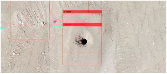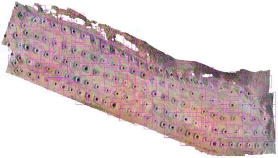 Once the training of SVM and CNN is finished, the next step is to verify (test) the detector’s accuracy. To achieve this, the “big” image (Orthomosaic and DEM) was subdivided into small patches using a sliding window algorithm. These patches are then classified as PS or NS using the SVM and CNN models (Figure 15). Finally, a non-maximum suppression method filters out the detections with the highest scores corresponding to the blastholes (Figure 16).