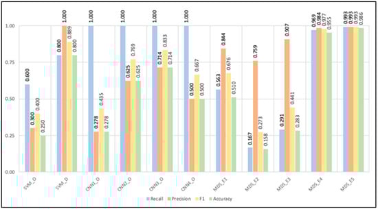 As depicted in Figure 25, the first model (SVM_O = SVM_Orthomosaic) exhibits low-performance metrics. In the second model (SVM_D = SVM_DEM), a significant improvement is observed in the metric scores compared to the first model, attributed to using Digital Elevation Maps (DEMs) for detections. CNN architectures were employed for the subsequent four groups of bars (CNN1_O, CNN2_O, CNN3_O, and CNN4_O) to achieve better performance results, particularly for CNN number 3 (CNN3_O), which stood out. Subsequently, we transitioned to the “multiple dataset stage”, where the first three rounds of experiments initially showed low-performance results (MDS_E1, MDS_E2, MDS_E3). However, the score results for experiment E4 (MDS_E4) demonstrated a significant improvement, while experiment E5 yielded outstanding results.