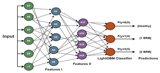 where represents the function of the encoding layer and denotes the function of the decoding layer. The neuron count in the encoding layer is typically lower compared to the input dimensionality. Consequently, the network is encouraged to reduce input dimensionality in this layer to eliminate redundancy. The typical back propagation technique with random weight initialization is well-suited for training a single autoencoder because it is a shallow neural network. Figure 2 illustrates the workflow of the anticipated sparse stacked autoencoder with LightGBM architecture for BRBs diagnostics under various loading conditions.