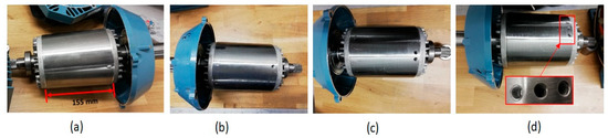 Table 4 shows the main parameters of the machines under investigation, including a four-pole, three-phase induction motor with a star/delta connection, 36 non-skewed stator slots, and 28 skewed rotor slots. The motors were rated at 7.5 kW power, with terminal voltages of 690 V/400 V at 50 Hz, and rated currents of 8.8 A/13.5 A.
