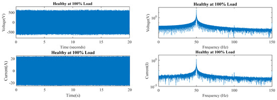 It is important to analyze the harmonic components of current, voltage, torque, and speed and understand how these components change with varying loading circumstances. Increasing the load might cause the harmonic components to change their behavior, a phenomenon which may hide fault-induced harmonics or make their consequences worse. Thus, it is crucial to precisely differentiate fault-related harmonics from load-induced changes for successful fault identification. Furthermore, the existence of harmonics close to supply and slotting frequencies emphasizes the need to thoroughly analyze particular frequency ranges to distinguish fault patterns from surrounding noise. Utilizing sophisticated signal processing methods and strong diagnostic approaches can improve the dependability and precision of fault diagnostics in motor systems, reducing downtime and maximizing operating efficiency. To detect abnormal conditions, the harmonic components of the current, voltage, torque, and speed should be considered. Fourier transforms of the mentioned signals can identify these constituents in the frequency domain. These frequency components are the function of load. Here, the load was found to increase and change harmonic component behavior. The fault-based harmonics were distributed in the entire spectrum. They significantly appeared near supply and slotting harmonics. Figure 7 and Figure 8 illustrate the frequency spectrum of current, voltage, speed, and torque with their FFTs at 100% loading conditions for the healthy and the three broken rotor bars, respectively.