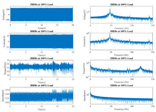Motor phase voltage, current, torque, and speed (from top to bottom) and their frequency spectrum for three broken rotor bars.