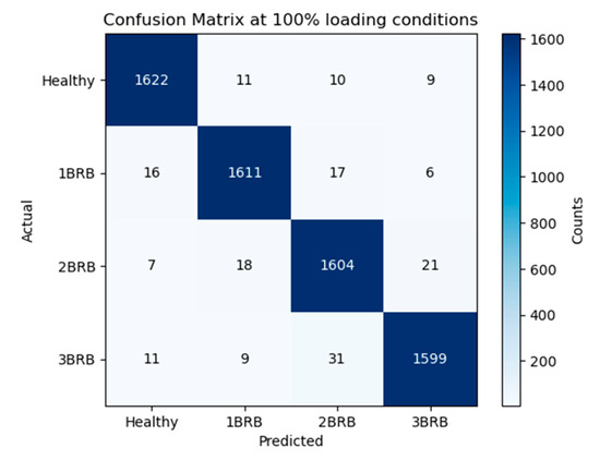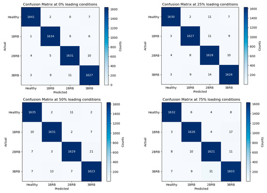 The suggested diagnostic framework (SSAE–LightGBM) incorporates a stratified feature-based cross-validation approach applied to the broken rotor bars dataset obtained from the test setup. The dataset was divided into folds, preserving the proportion of relevant features in each fold. This strategy facilitates a more accurate and comprehensive assessment of model performance, particularly beneficial for unbalanced or critical datasets. Leveraging the advanced SSAE–LightGBM method alongside strict stratified feature-based cross-validation enables thorough diagnostic investigations. The algorithm underwent fine-tuning through extensive experiments conducted on data generated at various loading levels (0%, 25%, 50%, 75%, and 100%). The effectiveness with which the model was able to diagnose rotor bar health states is represented visually via the confusion matrices. Confusion matrices provide an evaluation of the performance of a classifier across different health states. The classifier’s ability to resolve between rotor bars that were healthy and those that were damaged to various degrees is afforded by the comprehensive analysis this provides. It effectively maps out the efficiency and adaptability of the diagnostic process. The study displays confusion matrices illustrating the performance of the diagnostic framework, sparse stacked autoencoder (SSAE), and LightGBM under varying load conditions ranging from 0% to 100% for both healthy motors and those with damaged rotor bars. The matrices present the classification results, demonstrating the accuracy of our model in distinguishing between healthy and malfunctioning motor conditions across different operational loads. The confusion matrices at various loading levels demonstrate the resilience of our diagnostic method across a broad spectrum of operational scenarios. SSAE and LightGBM can effectively identify and classify BRB problems at various load levels, demonstrating the model’s reliability and efficiency in real-world industrial settings. In Figure 10, the results of the confusion matrices for healthy broken rotor bars at 0%, 25%, 50%, 75%, and 100% loading conditions are presented. As such, the model’s performance is depicted in different cases.